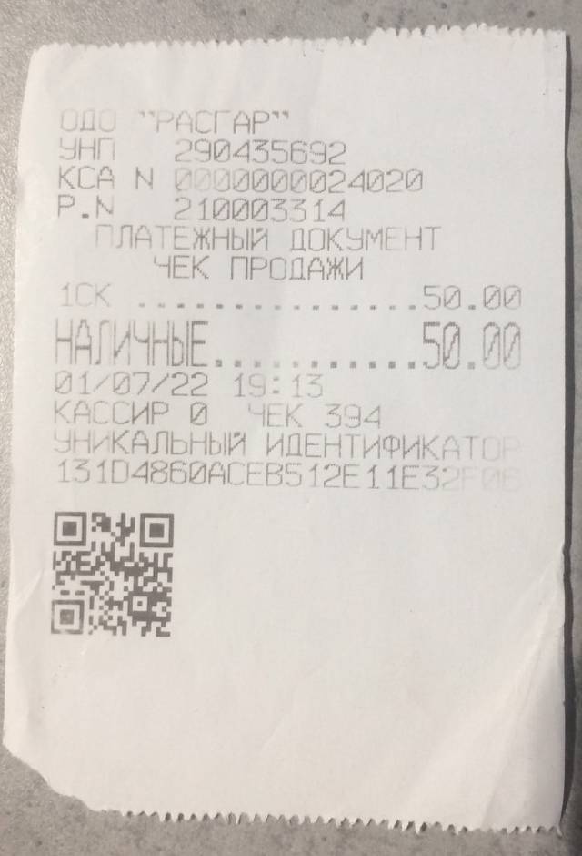 Чек кассового аппарата, подтверждающий прием денежных средств продавцом у покупателя.
