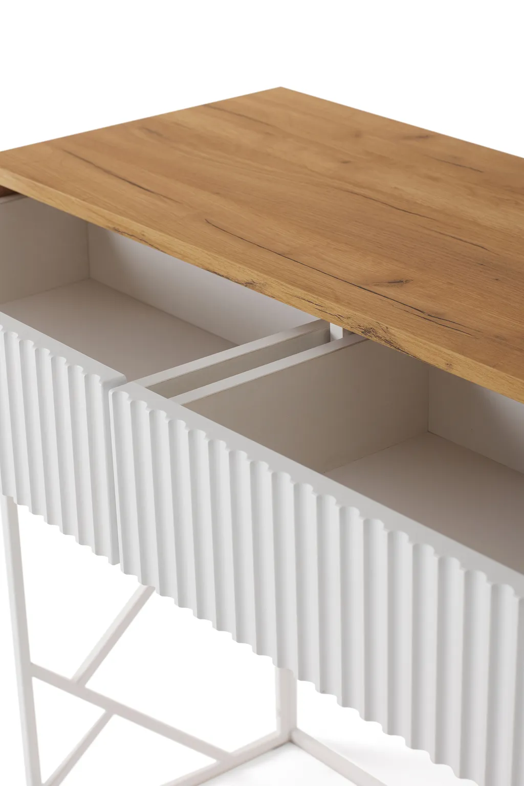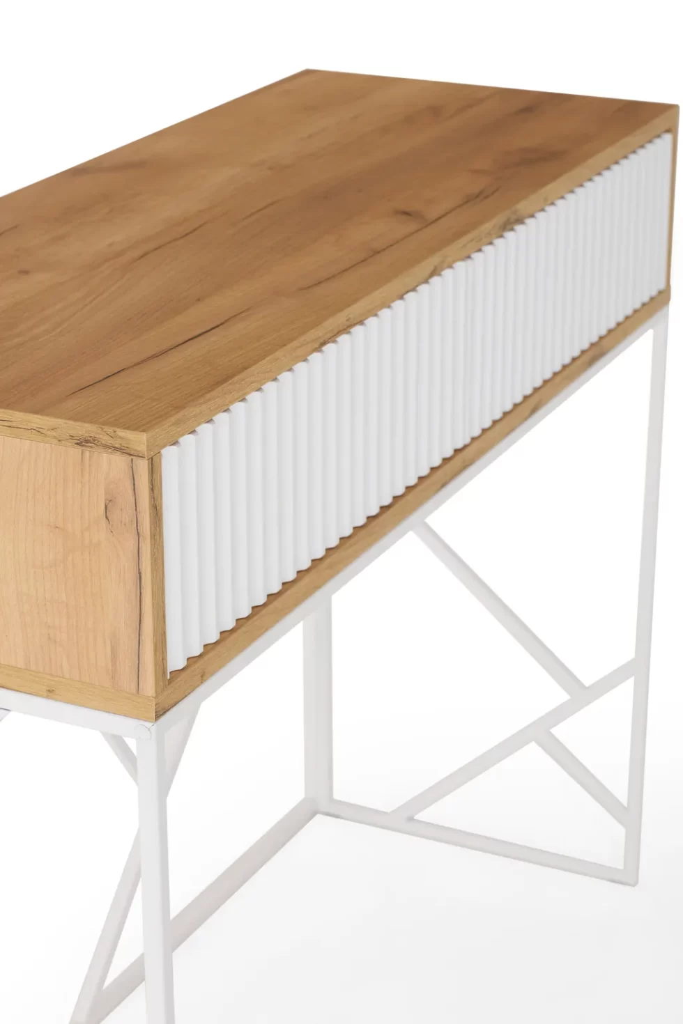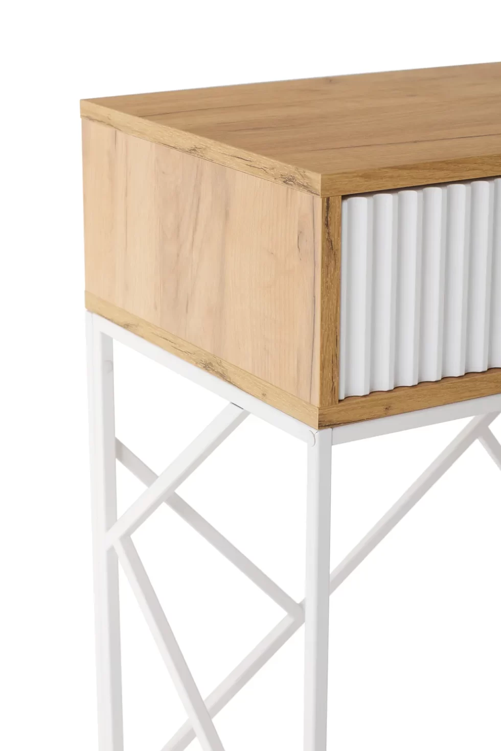 Столик Грация 2 представляет собой необычную консоль на элегантном и прочном металлическом каркасе. Корпус тумбы, выполненный из ЛДСП крафтовых древесных тонов, и фрезерованный фасад в форме волны, придают изделию легкость. Данная модель оборудована двумя выдвижными ящиками для хранения, которые легко открываются благодаря использованию направляющих скрытого монтажа push- to- open (нажал-открыл).