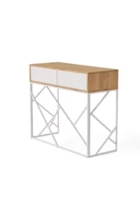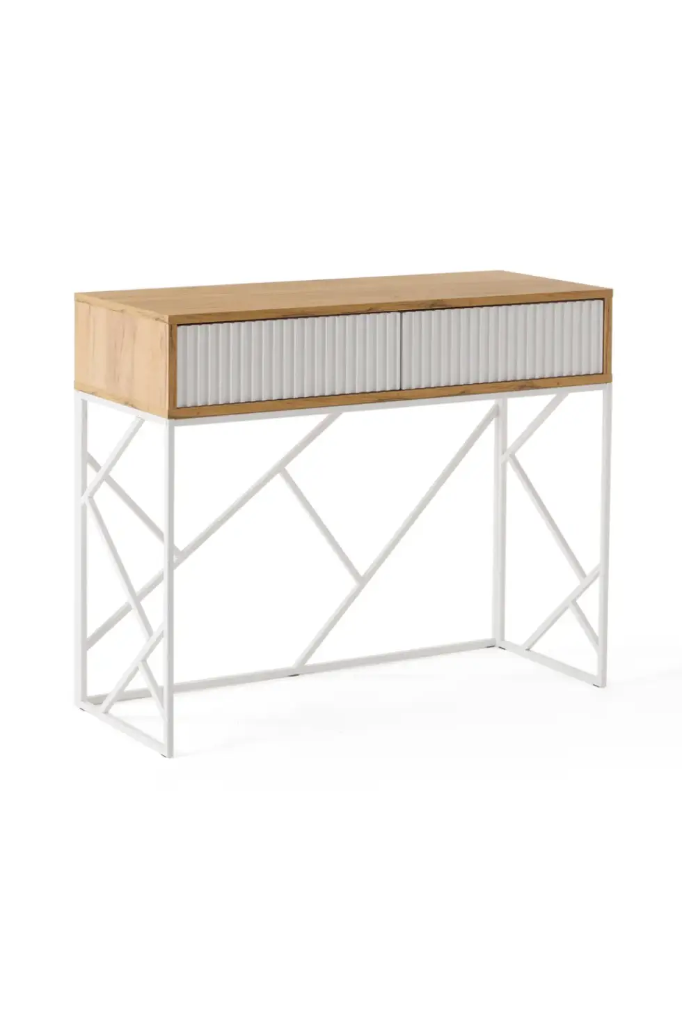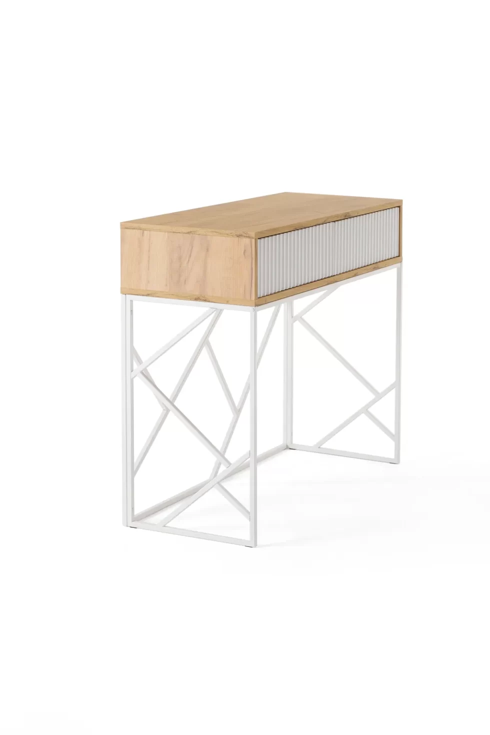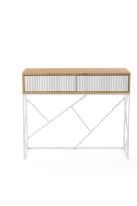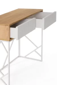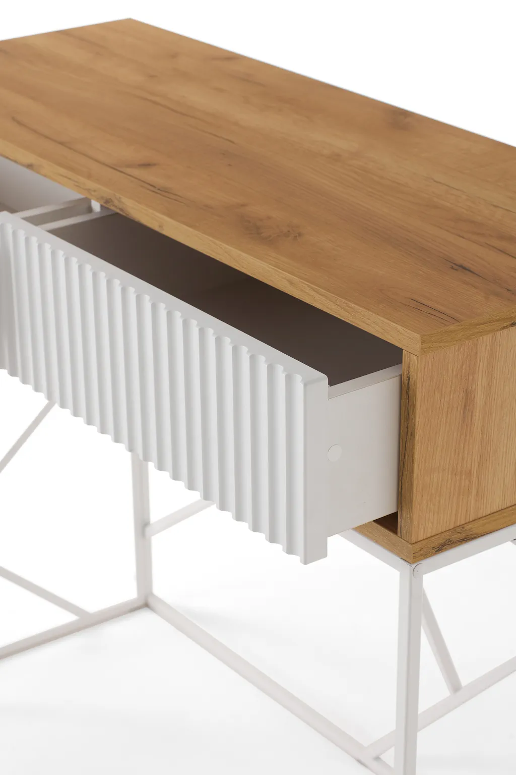 Столик Грация 2 представляет собой необычную консоль на элегантном и прочном металлическом каркасе. Корпус тумбы, выполненный из ЛДСП крафтовых древесных тонов, и фрезерованный фасад в форме волны, придают изделию легкость. Данная модель оборудована двумя выдвижными ящиками для хранения, которые легко открываются благодаря использованию направляющих скрытого монтажа push- to- open (нажал-открыл).