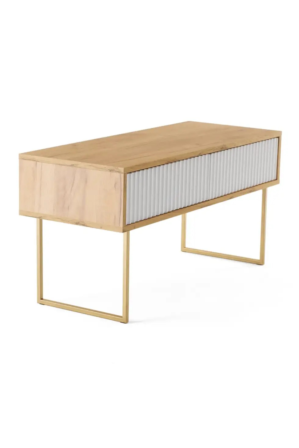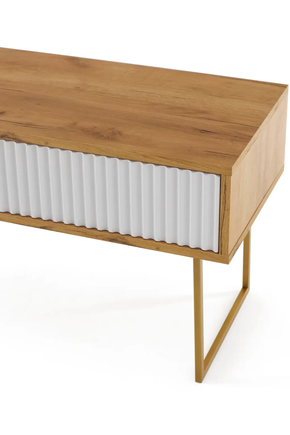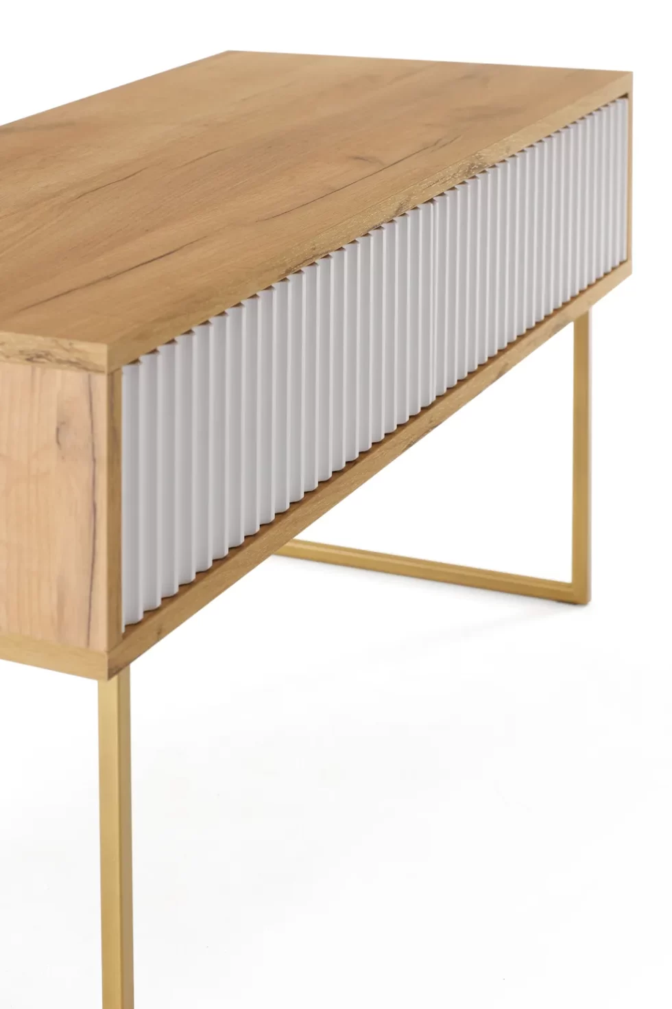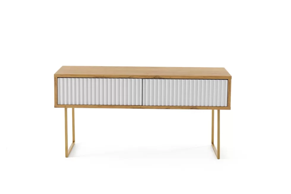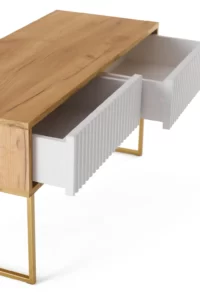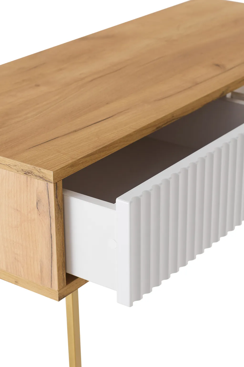 Консольный столик «Грация 4» в скандинавском стиле будет функциональным предметом интерьера гостиной или ярким украшением спальни. Столик оснащен двумя выдвижным ящиками с фрезерованным фасадом из МДФ с покрытием ПВХ пленкой в виде волны, который придает изделию неповторимый шарм. Крышка, дно и боковины из ЛДСП 18 мм, цвет дуб сантана. Отличительной особенностью данной полки является использование направляющих скрытого монтажа push- to- open (нажал-открыл).
