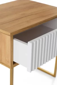 Прикроватный журнальный столик «Грация 6» в скандинавском стиле будет ярким украшением спальни. Столик оснащен выдвижным ящиком с фрезерованным фасадом из МДФ с покрытием ПВХ пленкой в виде волны, который придает изделию неповторимый шарм. Крышка, дно и боковины из ЛДСП 18 мм, цвет дуб сантана. Отличительной особенностью данной полки является использование направляющих скрытого монтажа push- to- open (нажал-открыл).