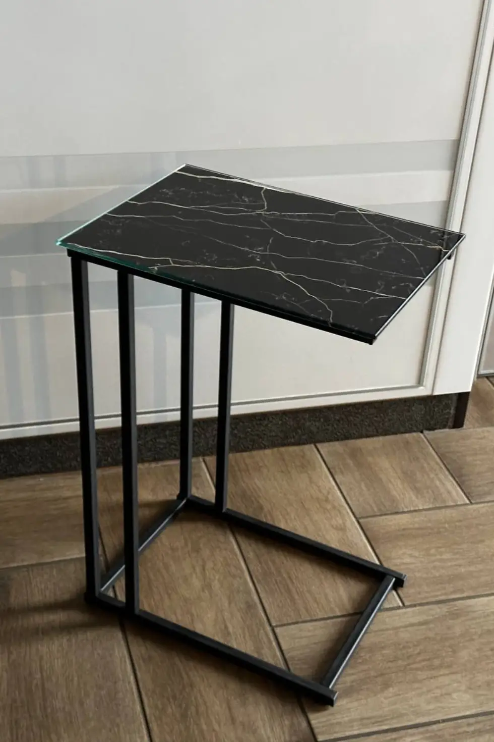 Столик с прямоугольной столешницей выполнен из травмобезопасного стекла или ЛДСП, а основание — из металлического каркаса с полимерным покрытием. Столик способен выдержать нагрузку до 10 кг.